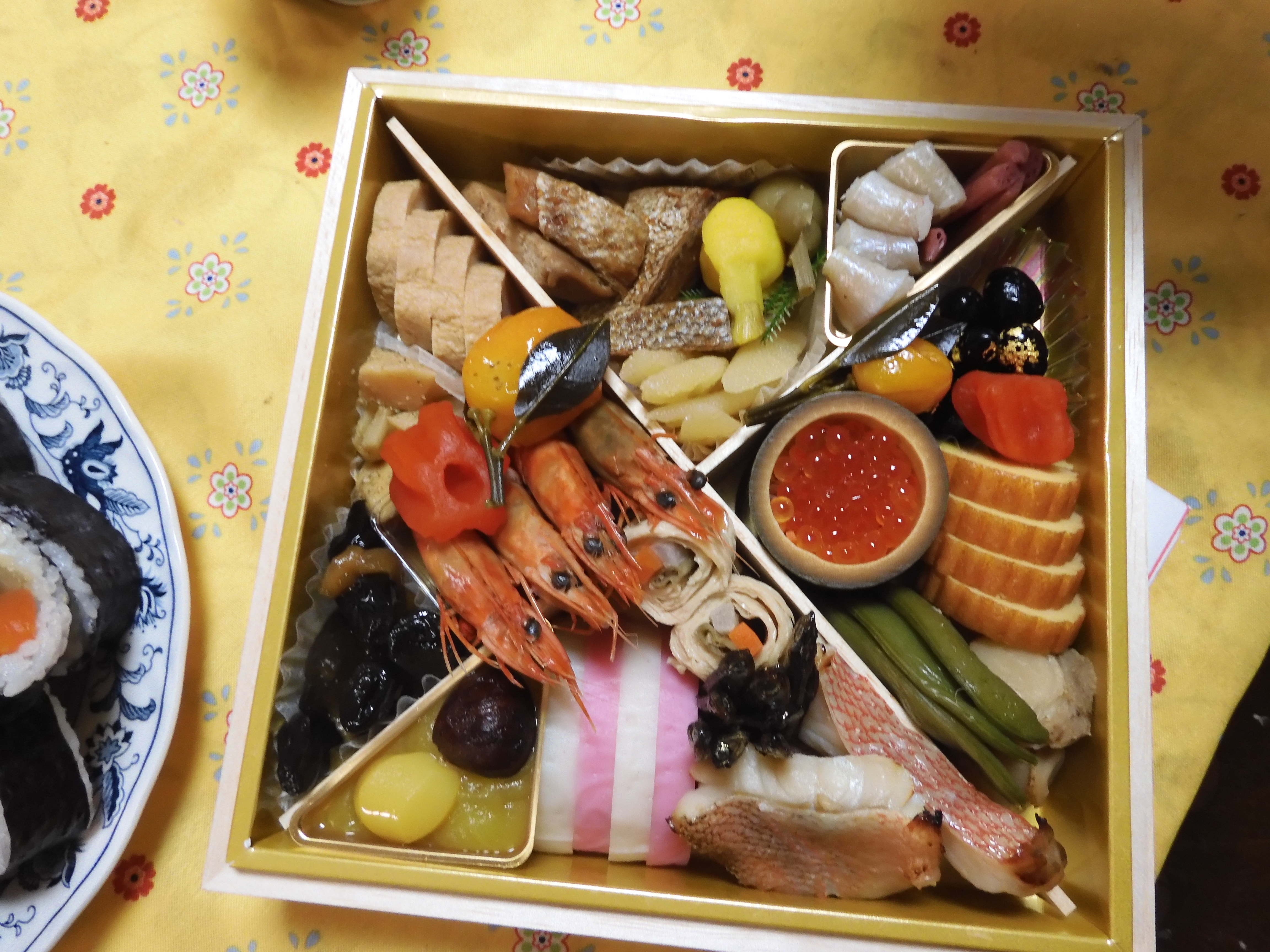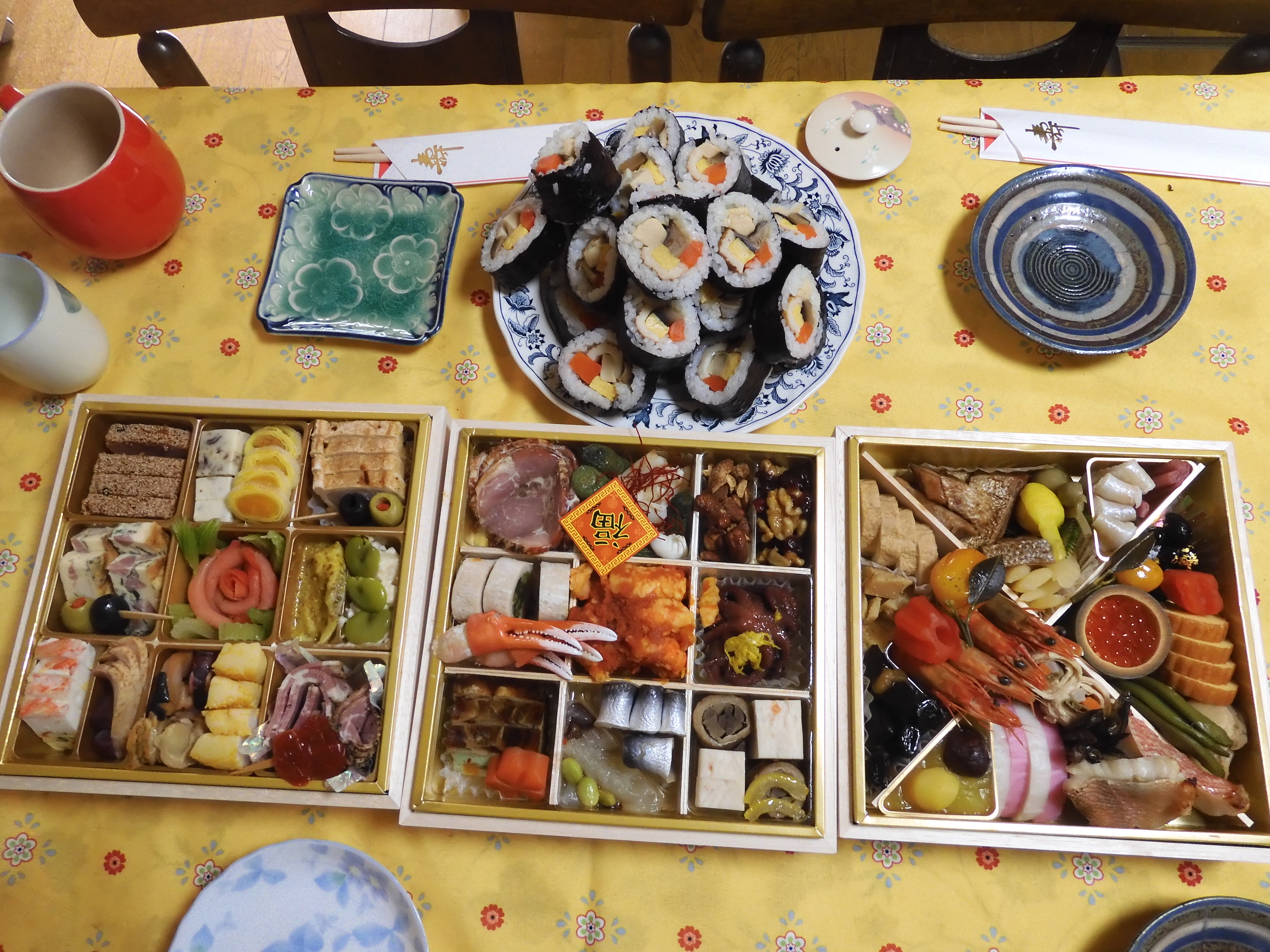 As in so many cultures, food plays a large part in Japanese New Year celebrations the main feature being o-secchi ryori, a pre-prepared (or purchased) box with several layers of what we might call ‘finger food’ which will be grazed upon over the holiday period – using chopsticks of course! So, this formed the basis for our lunches and dinners for the first two days.