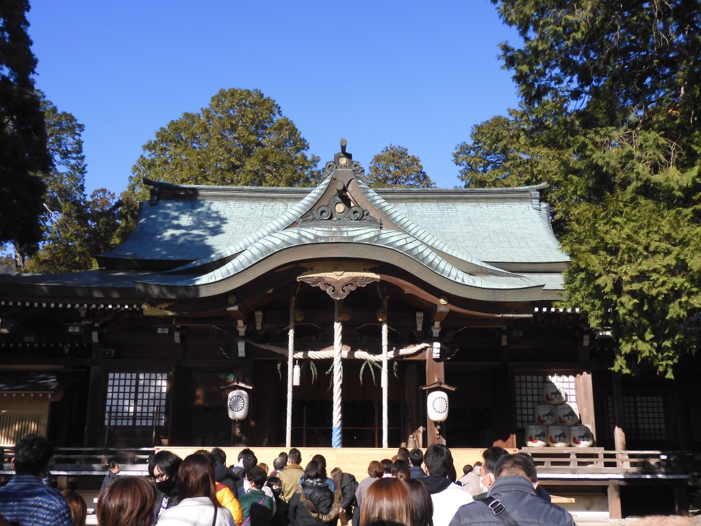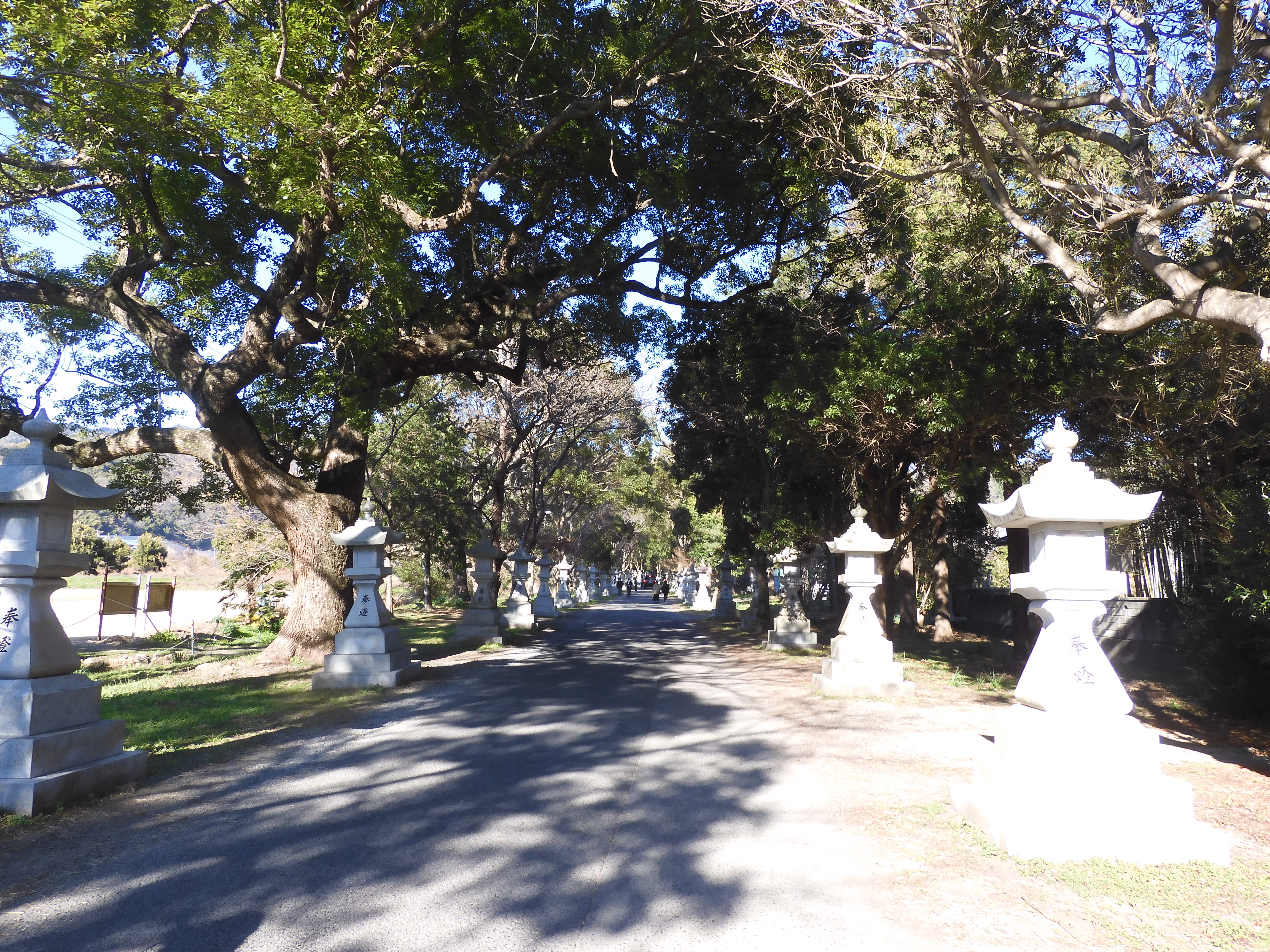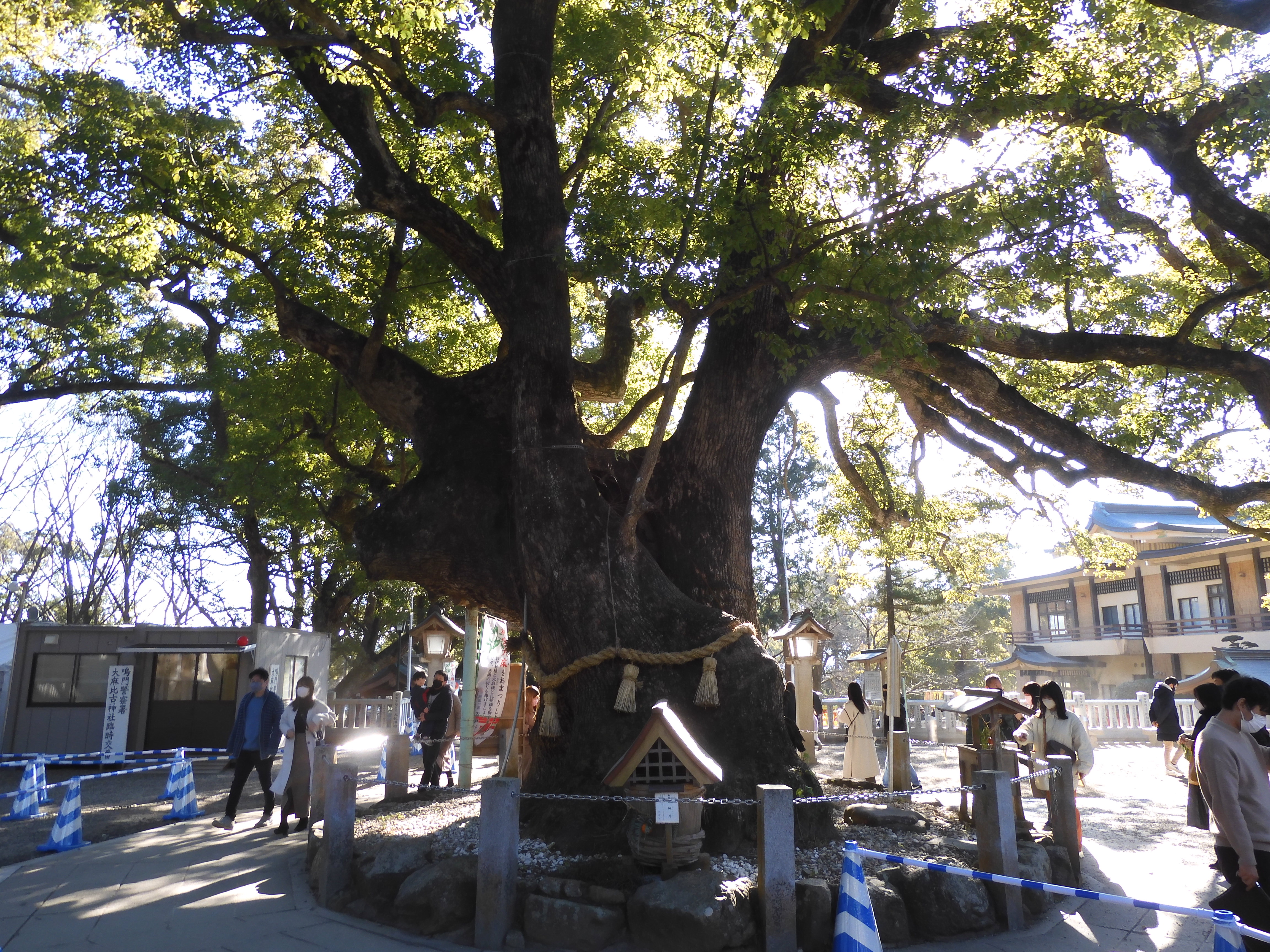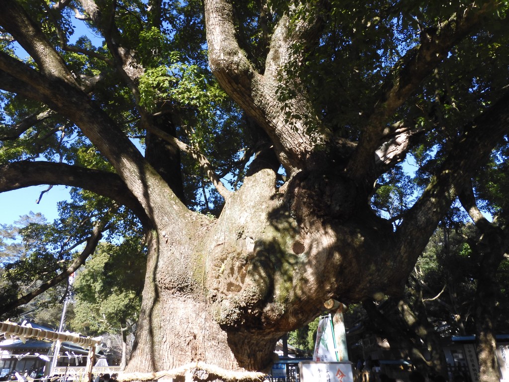 The cemetery is in the grounds of a buddhist temple the religion under which most funerals take place. But, in a multi-denominational society it’s important to keep well-covered and another New Year tradition is to visit a shrine to give thanks to the Shinto Gods for the year just past and to pray for good health for the year to come. For our own devotions we drove 10km to the Oasahiko Shrine in the Bando area of Naruto and enjoyed a long walk along the tree-lined approach to the shrine with other worshippers. Under Shintoism, gods also exist in nature especially trees, so as well as praying at the main shrine, we also did so at the 1,000-year-old, 22 metre tall, Go-shinboku camphor tree.