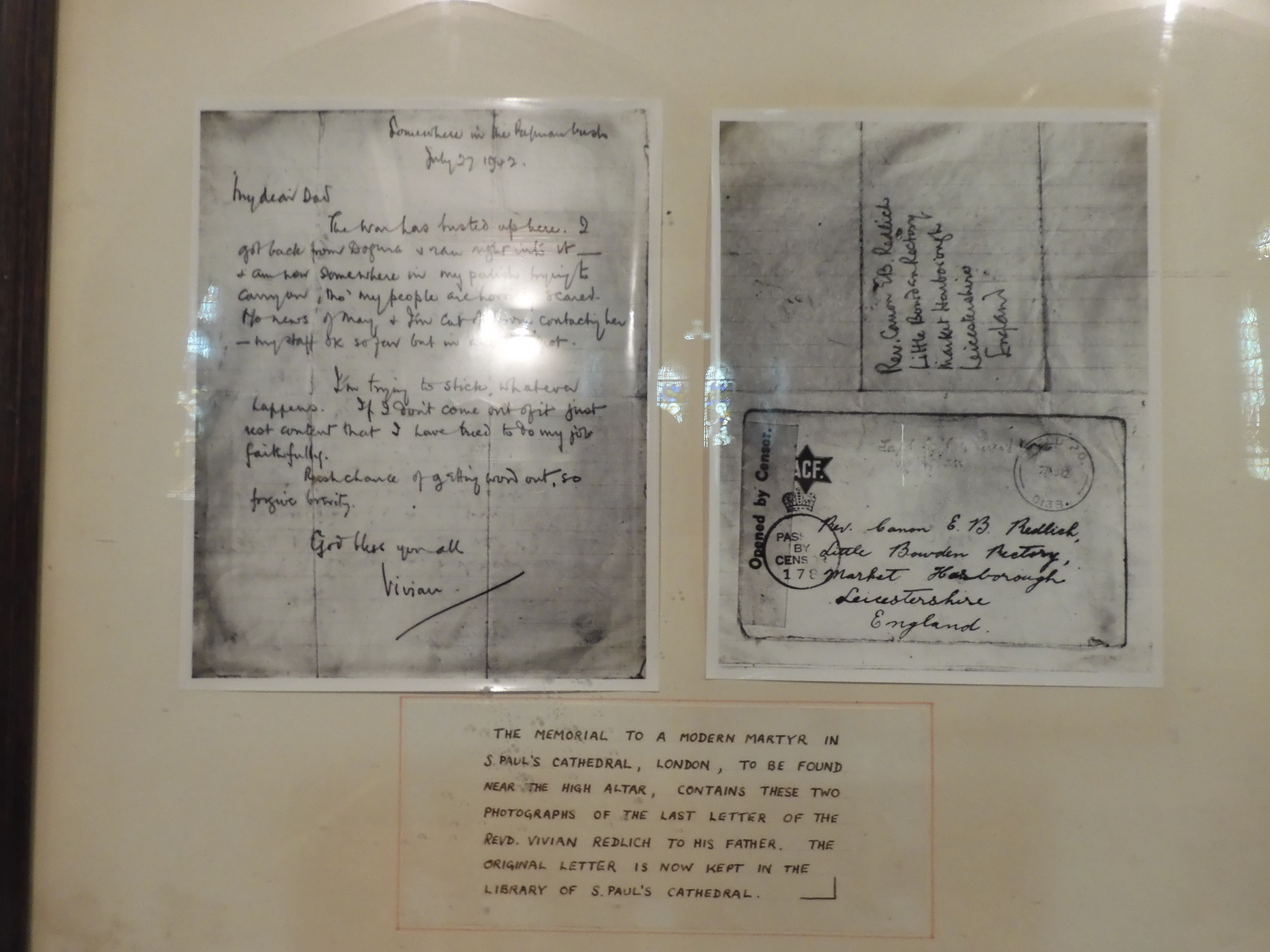 After undergoing theological training in England himself, Vivian served with the brotherhood of St. Andrew in Australia before volunteering for missionary work in nearby Papua New Guinea where he soon found himself involved in the war with Japan, writing what would be his final letter to his father on 27 July 1942, which is also displayed on the wall of the church.