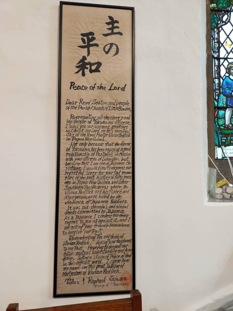 It was originally believed that Redlich was taken from his Mission House by the Japanese army, and beheaded on a nearby beach, thus prompting the letter of profuse apology from the Bishop of Yokohama to the people of Leicestershire. However 70 years later, it emerged that this was not the case. There is a further sad twist to this story, as Vivian had met and fallen in love with May Hayman, an Australian mission nurse who had cared for him during illness. Only recently engaged, they were working at different mission stations about 40km apart in the jungle, and Nurse Hayman had been captured by the Japanese at the time of the invasion. It is now believed that Vivian Redlich was on his way to rescue her when he was attacked with spears and killed by local tribesmen. Nurse Hayman managed to escape into the jungle, with another nurse but they were both re-captured and executed by the Japanese army.